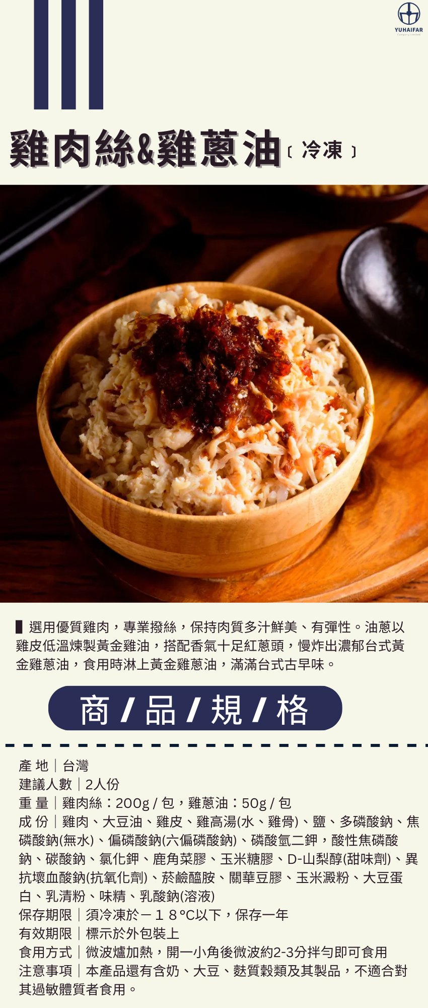 選用優質雞肉,專業撥絲,保持肉質多汁鮮美、有彈性。油蔥以雞皮低溫煉製黃金雞油,搭配香氣十足紅蔥頭,慢炸出濃郁台式黃金雞蔥油,食用時淋上黃金雞蔥油,滿滿台式古早味。